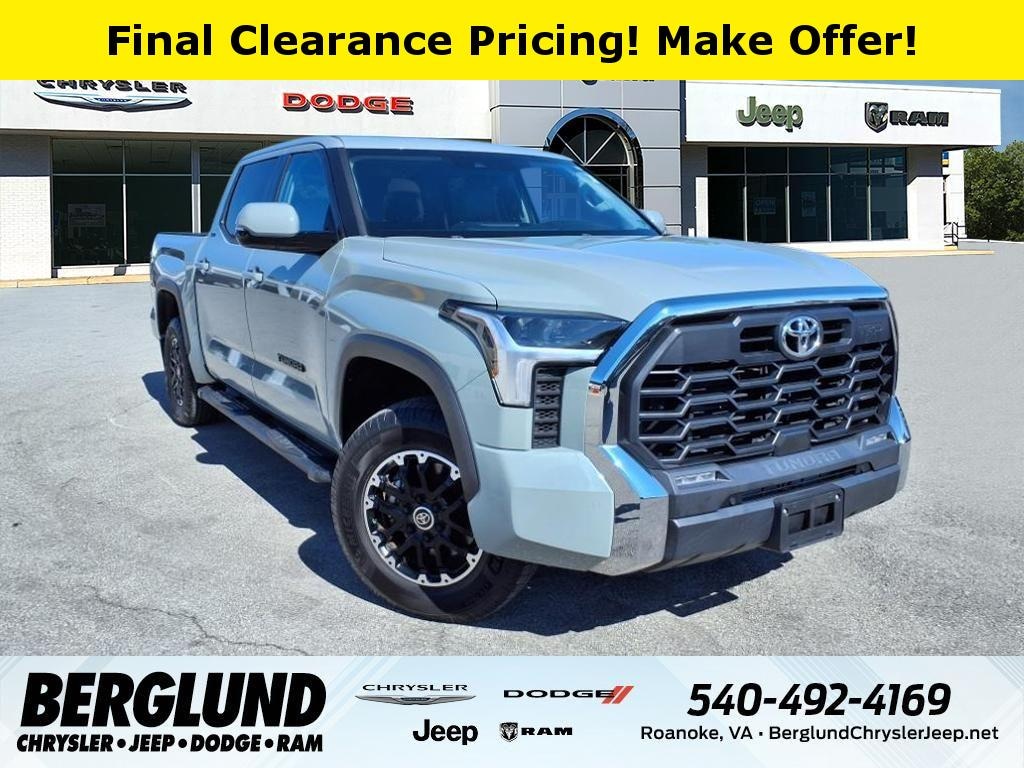 2022 Toyota Tundra SR5 â" 4WD, V6, 3.5L (3445 cc) ⢠Roanoke, VA This low-mileage 2022 Toyota Tundra SR5 is a standout choice for drivers in Roanoke, VA seeking rugged capability with modern convenience. With just 12,171 miles, this 4WD Toyota Tundra features Toyota's efficient 3.5L V6 gasoline engine that balances strong towing potential and everyday drivability. The SR5 trim adds practicality and comfort, making it a versatile truck for work or weekend adventures. Safety and technology are well-represented with a Blind Spot Monitor and Back-Up Camera to enhance awareness on the road and during parking. Stay connected with Hands-Free Bluetooth for calls and media, and enjoy the convenience of Remote Start for climate control before you step in. This vehicle's clean history is backed by CARFAX 1-Owner status, offering added peace of mind for your purchase. Priced competitively to be the best value in the area, this Toyota Tundra pairs low mileage with an attractive price point that won't last long. Whether you need a dependable daily driver or a capable truck for hauling and off-road trips, this Toyota Tundra SR5 delivers. Contact us in Roanoke, VA to schedule a test drive and secure the best-priced, low-mileage 2022 Toyota Tundra SR5 available.